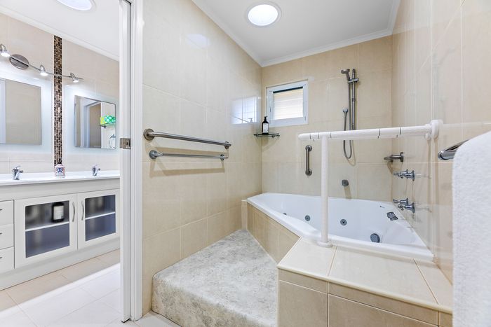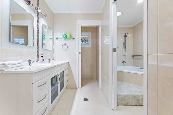 The large upstairs bathroom has a spa bath, two toilets and a double-sized vanity.