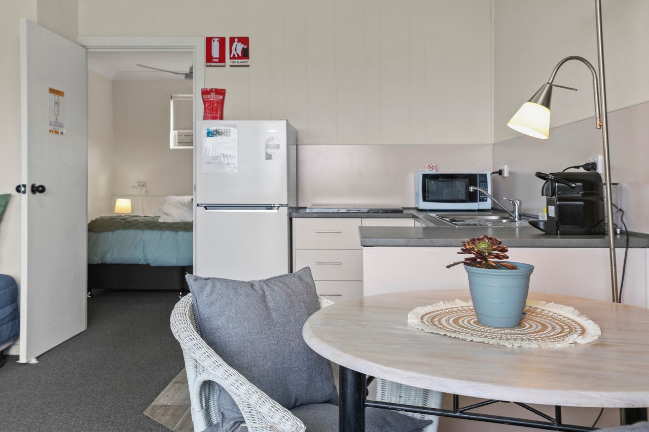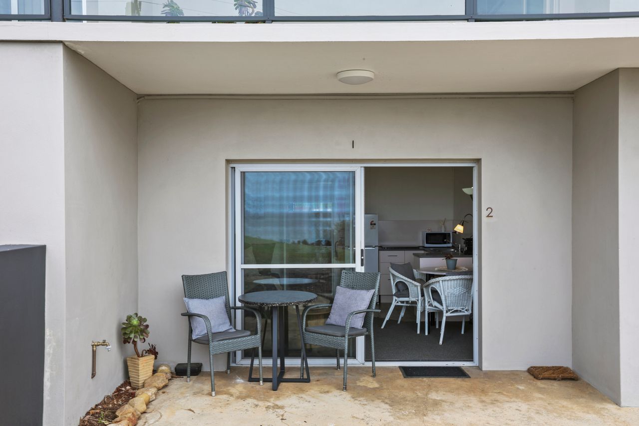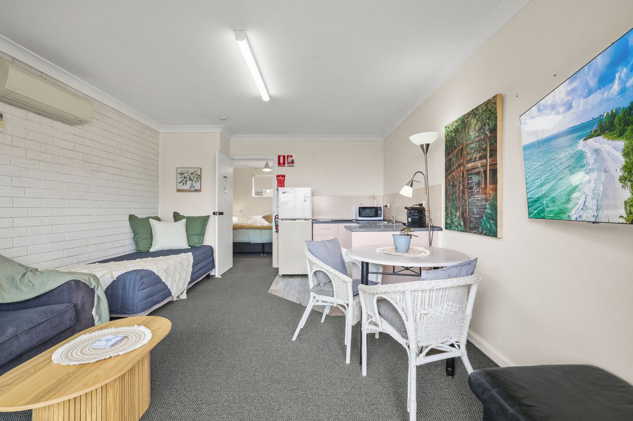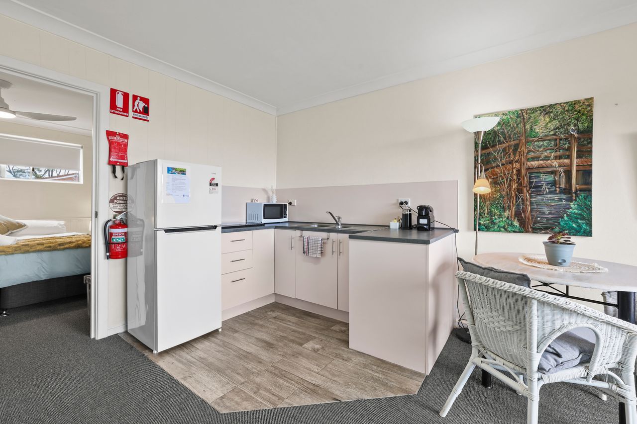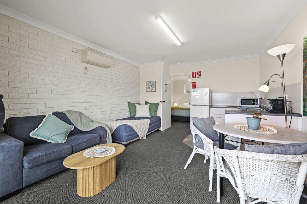 These well-appointed one-bedroom units include a separate bedroom with queen bed (king bed in unit 2), single bed in lounge area, bathroom, kitchen area, dining area, lounge area, microwave, cooktop, Smart TV and undercover balcony area.