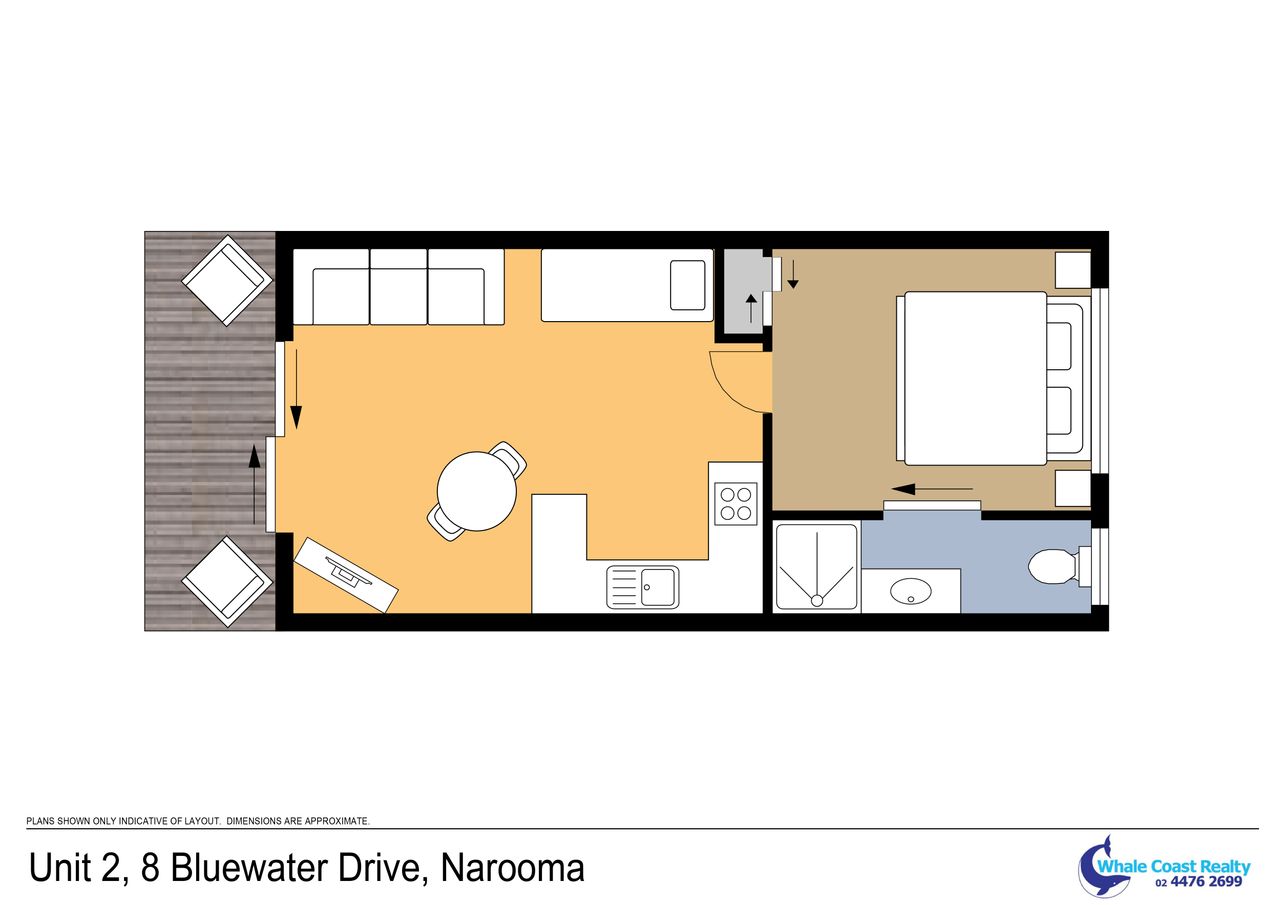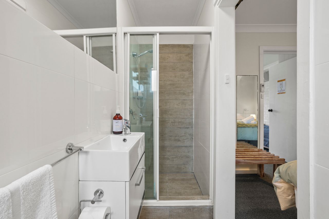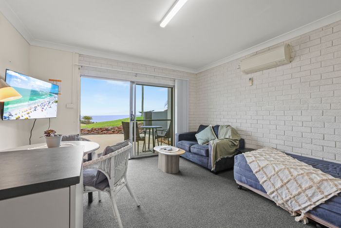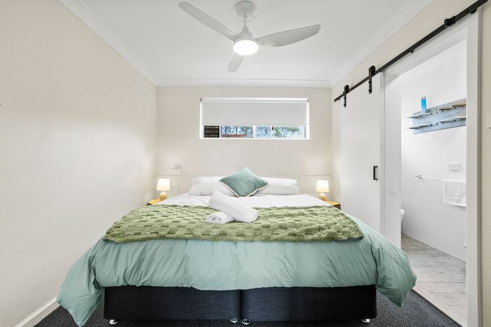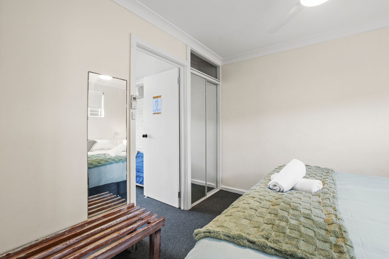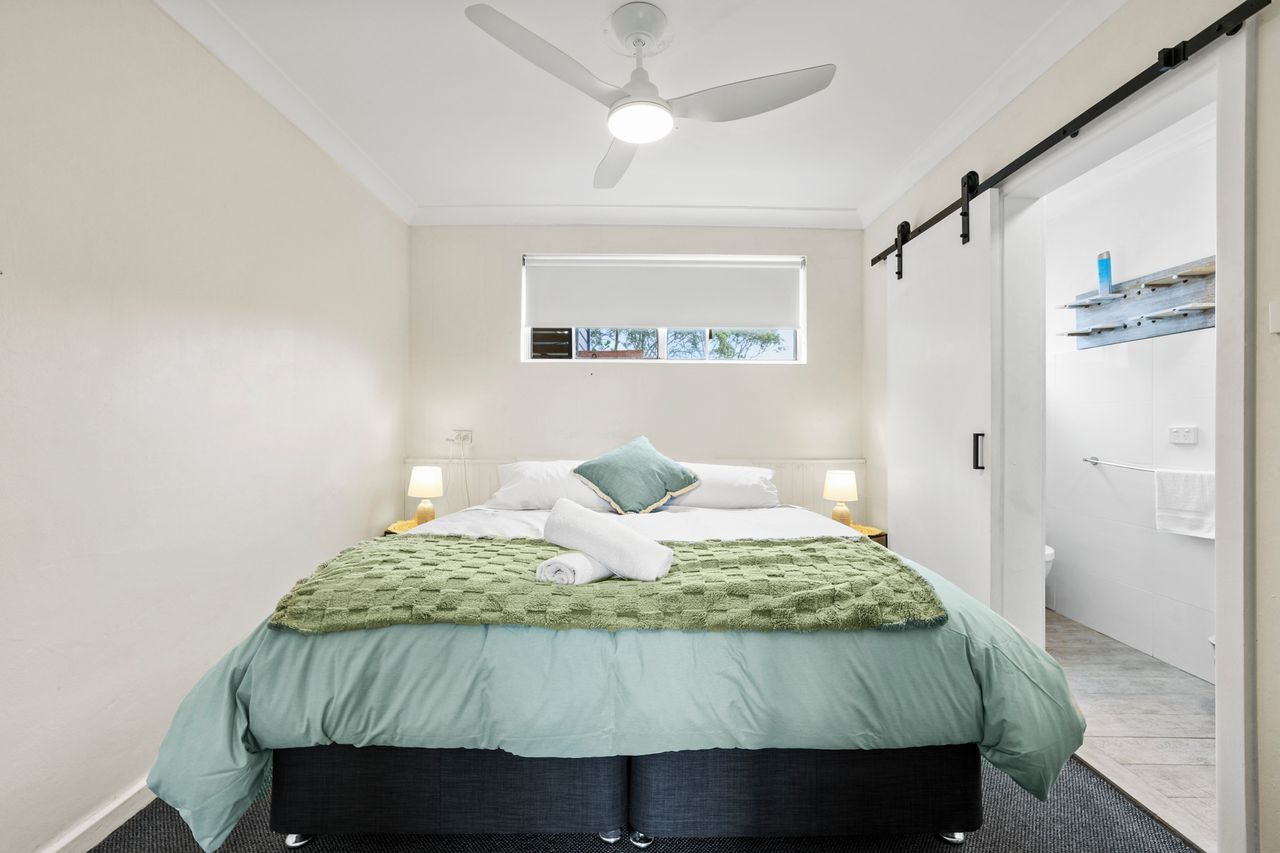 These well-appointed one-bedroom units include a separate bedroom with queen bed (king bed in unit 2), single bed in lounge area, bathroom, kitchen area, dining area, lounge area, microwave, cooktop, Smart TV and undercover balcony area.