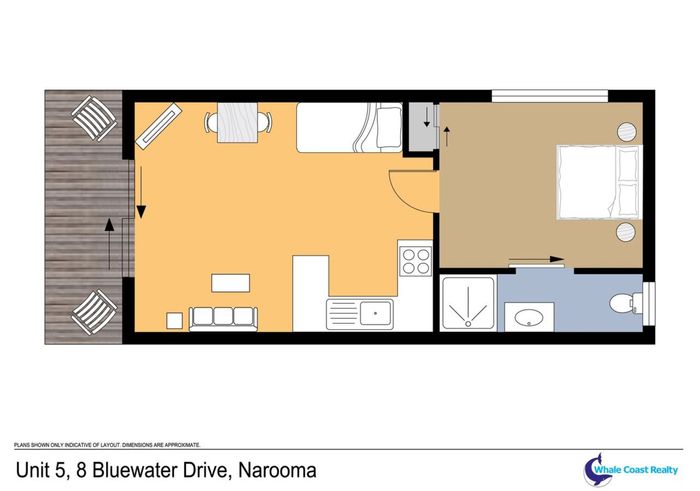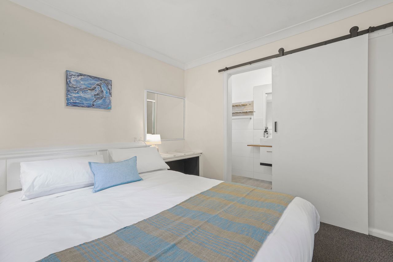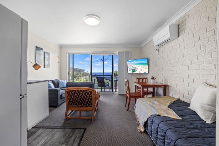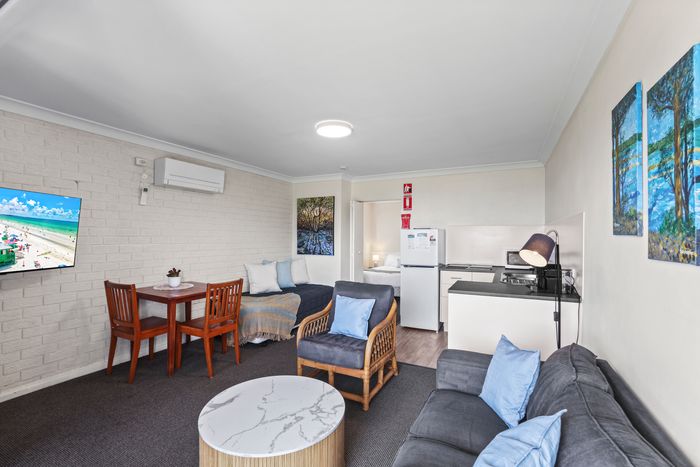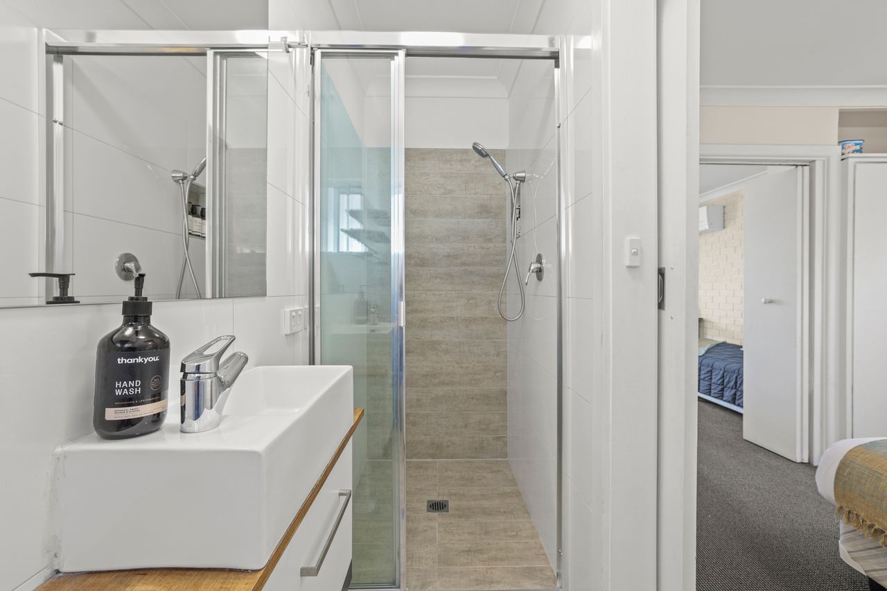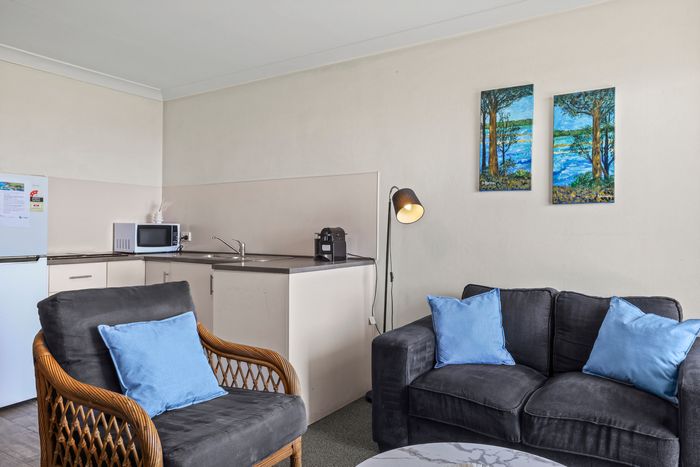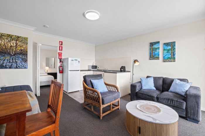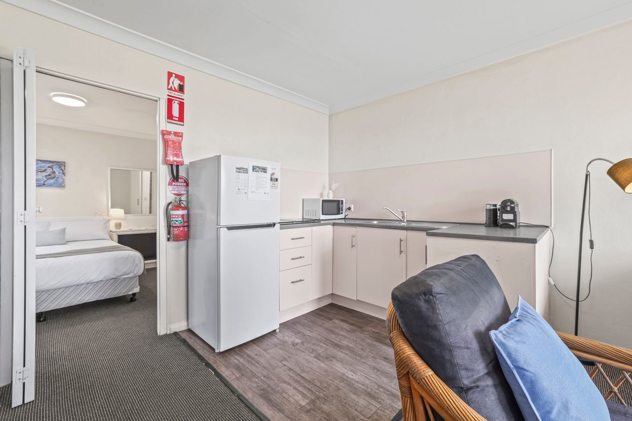 These well-appointed one-bedroom units include a separate bedroom with queen bed (king bed in unit 2), single bed in lounge area, bathroom, kitchen area, dining area, lounge area, microwave, cooktop, Smart TV and undercover balcony area.
