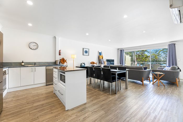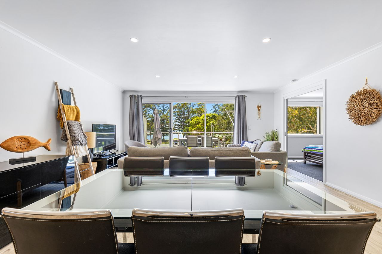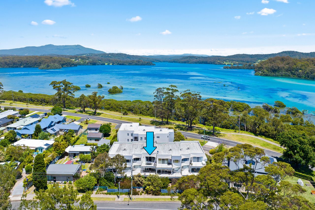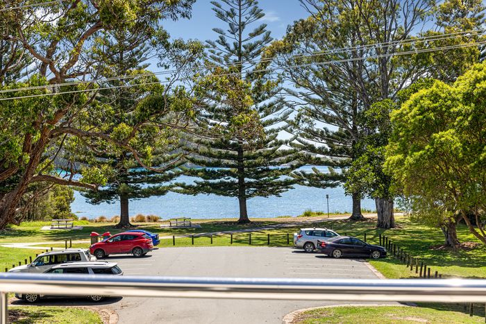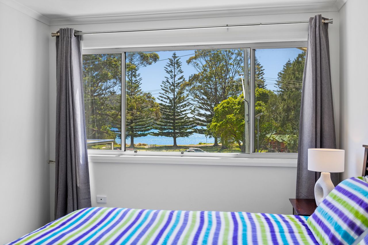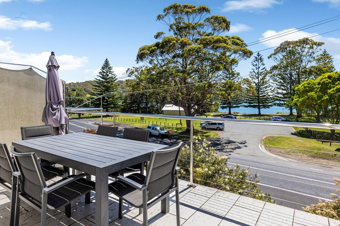 1 Top floor unit in the front block with easterly aspect. Indulge yourself in some of Narooma's finest accommodation located only 50 metres from the water and next to Wagonga Inlet Bridge. This spacious 3 bedroom, 2 bathroom apartment has all the luxuries of modern living with a huge flat screen Tv, Dvd/Blu-Ray, Foxtel, WiFi and Google Home; microwave, dishwasher, reverse cycle air conditioning, tandem garage, and security gating. Front balcony with dining and gas Bbq. Main bed has a king bed, second bedroom has a double and the third bedroom has a single with a roll out underneath.