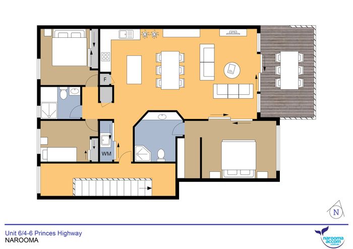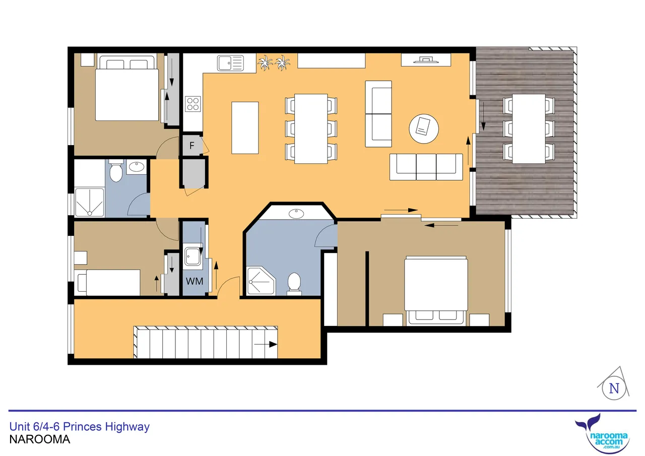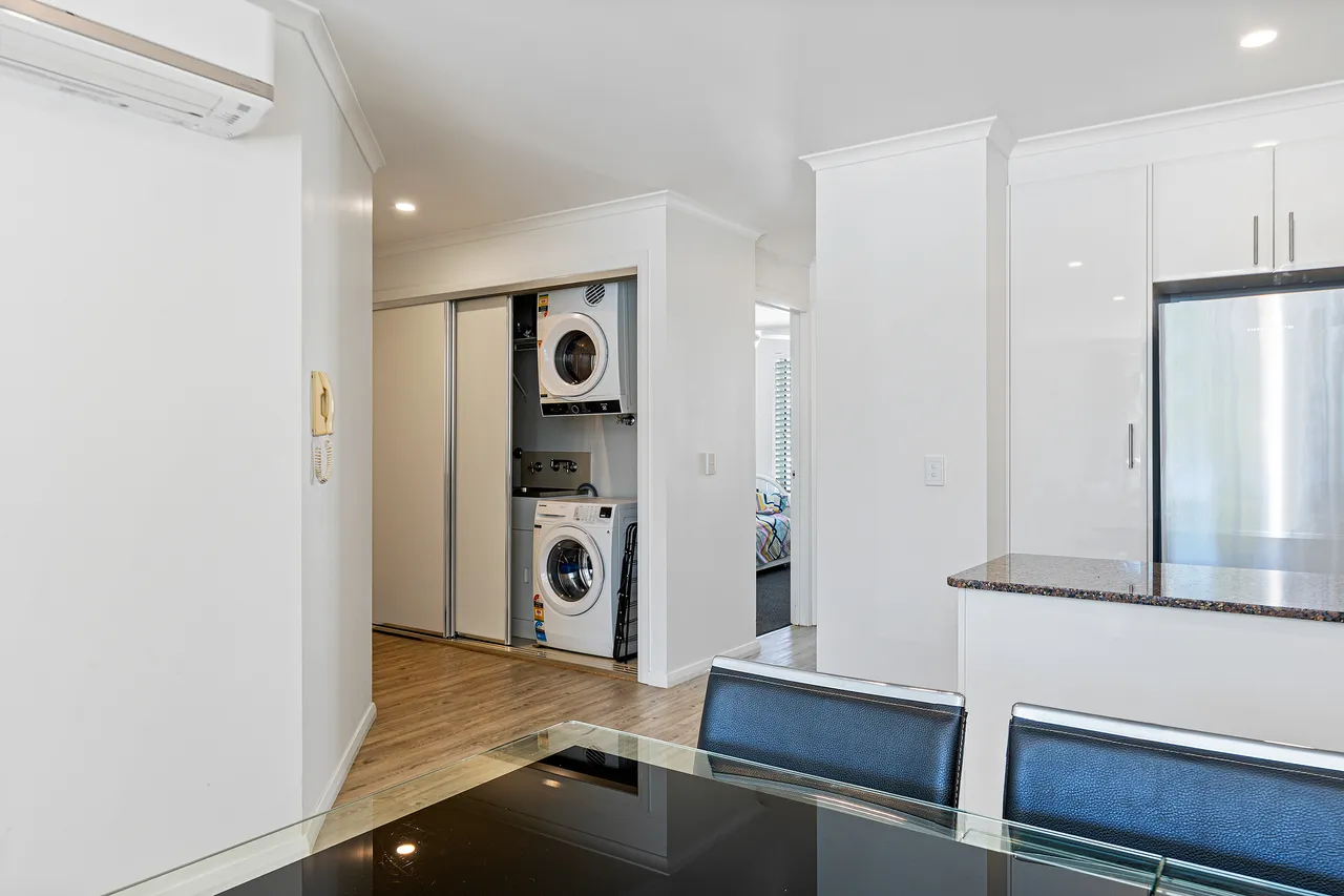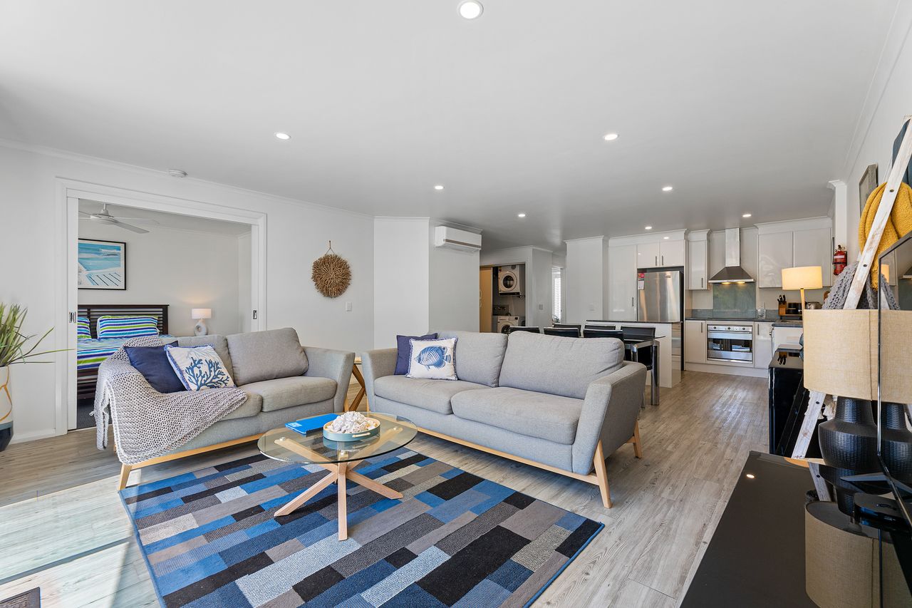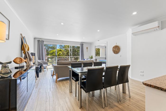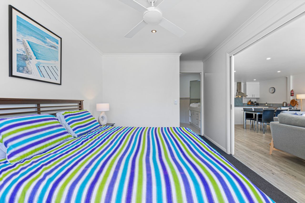 1 Top floor unit in the front block with easterly aspect. Indulge yourself in some of Narooma's finest accommodation located only 50 metres from the water and next to Wagonga Inlet Bridge. This spacious 3 bedroom, 2 bathroom apartment has all the luxuries of modern living with a huge flat screen Tv, Dvd/Blu-Ray, Foxtel, WiFi and Google Home; microwave, dishwasher, reverse cycle air conditioning, tandem garage, and security gating. Front balcony with dining and gas Bbq. Main bed has a king bed, second bedroom has a double and the third bedroom has a single with a roll out underneath.